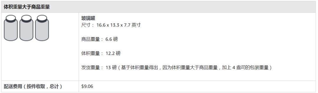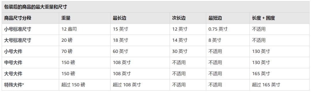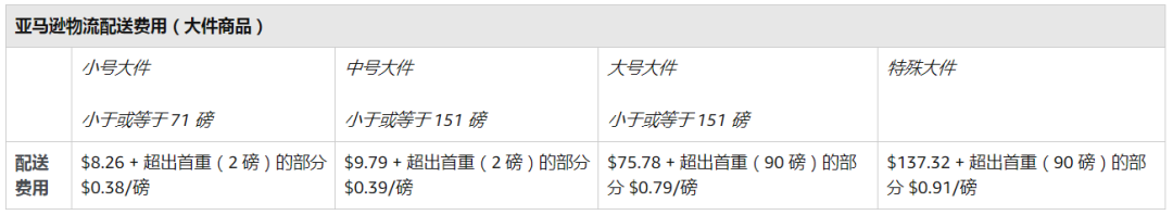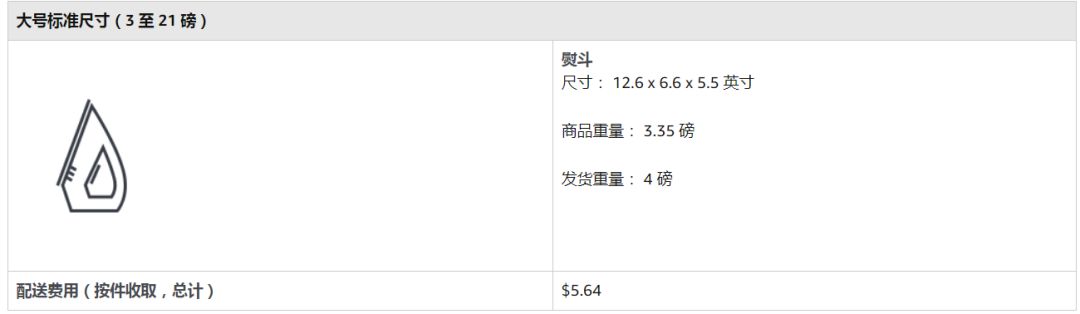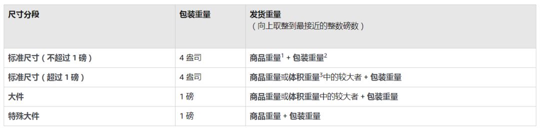 3.对于重量超过 1 磅的大号标准尺寸商品和所有小号大件、中号大件和大号大件商品,亚马逊使用体积重量(当其大于单件重量时)。